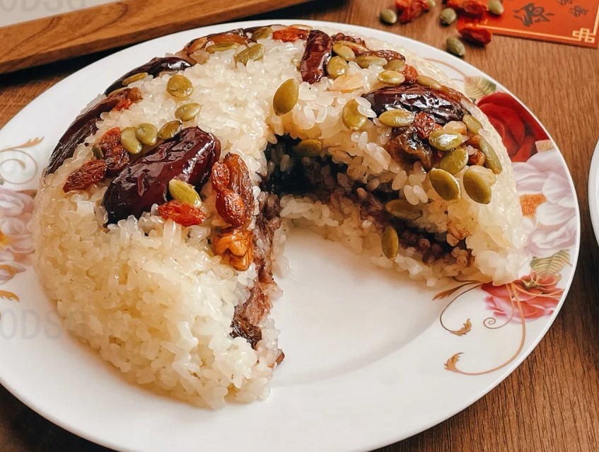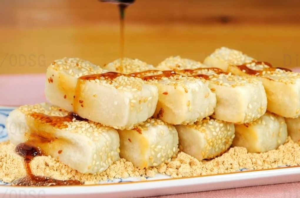 Nian Gao/ Ci Ba (Pastel de Arroz de Año Nuevo – 年糕/ 糍粑 ): “Hecho de harina de arroz glutinoso, suele presentarse en sabores de azúcar roja (morena) o azúcar blanca. Su textura pegajosa simboliza la unión familiar.”