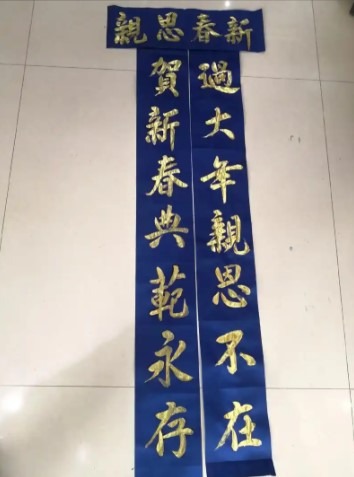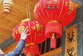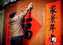 “Se colocan dísticos primaverales y el carácter ‘Fu‘ (felicidad) en las entradas. Pegarlo boca abajo simboliza que la fortuna ‘ha llegado