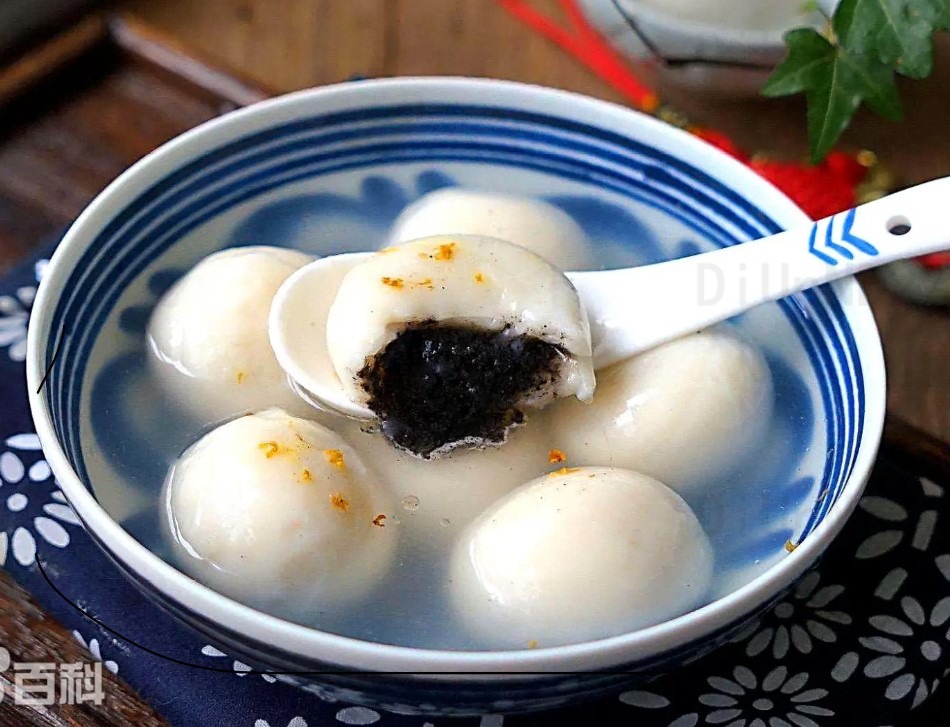 Tangyuan (Bolitas de arroz glutinoso – 汤圆 ): “Pequeñas esferas rellenas que se sirven en sopa caliente, representando la reunión completa (Tuanyuan).”