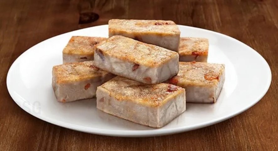 Pasteles Salados (Radish Cake y Taro Cake – 萝卜糕/芋头糕 ): “Muy populares en el sur (especialmente en la cocina cantonesa), se elaboran con rábano rallado o trozos de taro, mezclados con harina de arroz y trozos de lawei (embutidos curados). Se fríen hasta quedar crujientes por fuera y tiernos por dentro.”